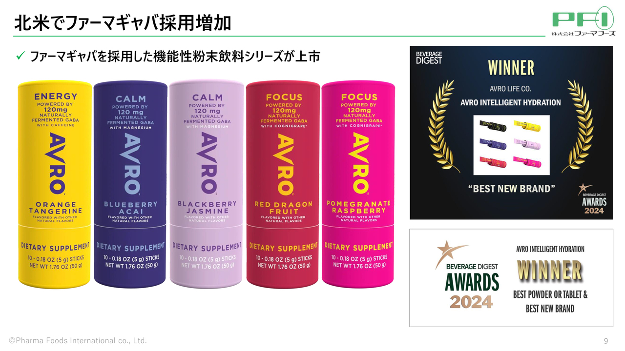 北米では、「ファーマギャバ」を主成分とした機能性粉末飲料ブランド「AVRO」が上市されました。コカ・コーラ社やPepsiCo社などの大手170社がエントリーした「Beverage Digest Awards」で「AVRO」が最優秀ブランド賞を受賞するなど、北米における「ファーマギャバ」への関心が一層高まっています。