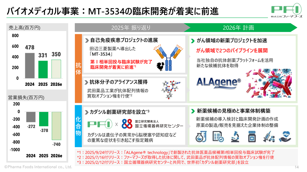 バイオメディカル事業における2025年7月期の振り返りとして、昨日のプレスリリースのとおり、田辺三菱製薬へ導出した抗体医薬品候補「MT-3534」が第Ⅰ相単回投与臨床試験を完了しました。