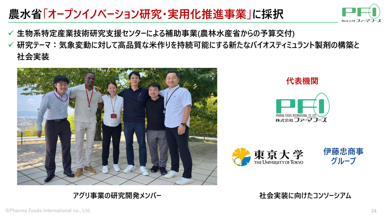 これらのエビデンスが認められ、農水省の補助金であるオープンイノベーション研究・実用化推進事業に今年採択されました。