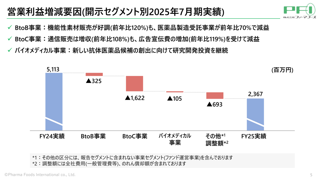 次に、営業利益の増減要因についてです。BtoB事業では、機能性素材販売が前年比120パーセントと好調でしたが、医薬品製造受託事業の売上が前年比70パーセントとなり、結果として減益となりました。