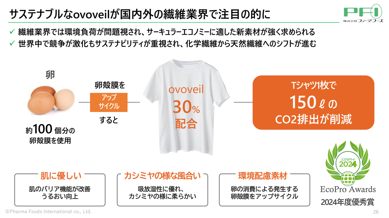 総額50億円を超える3つの開発プロジェクトを推進しており、中でも卵殻膜由来の繊維「ovoveil(オボヴェール)」は、すでに販売を開始し、営業活動も行っています。