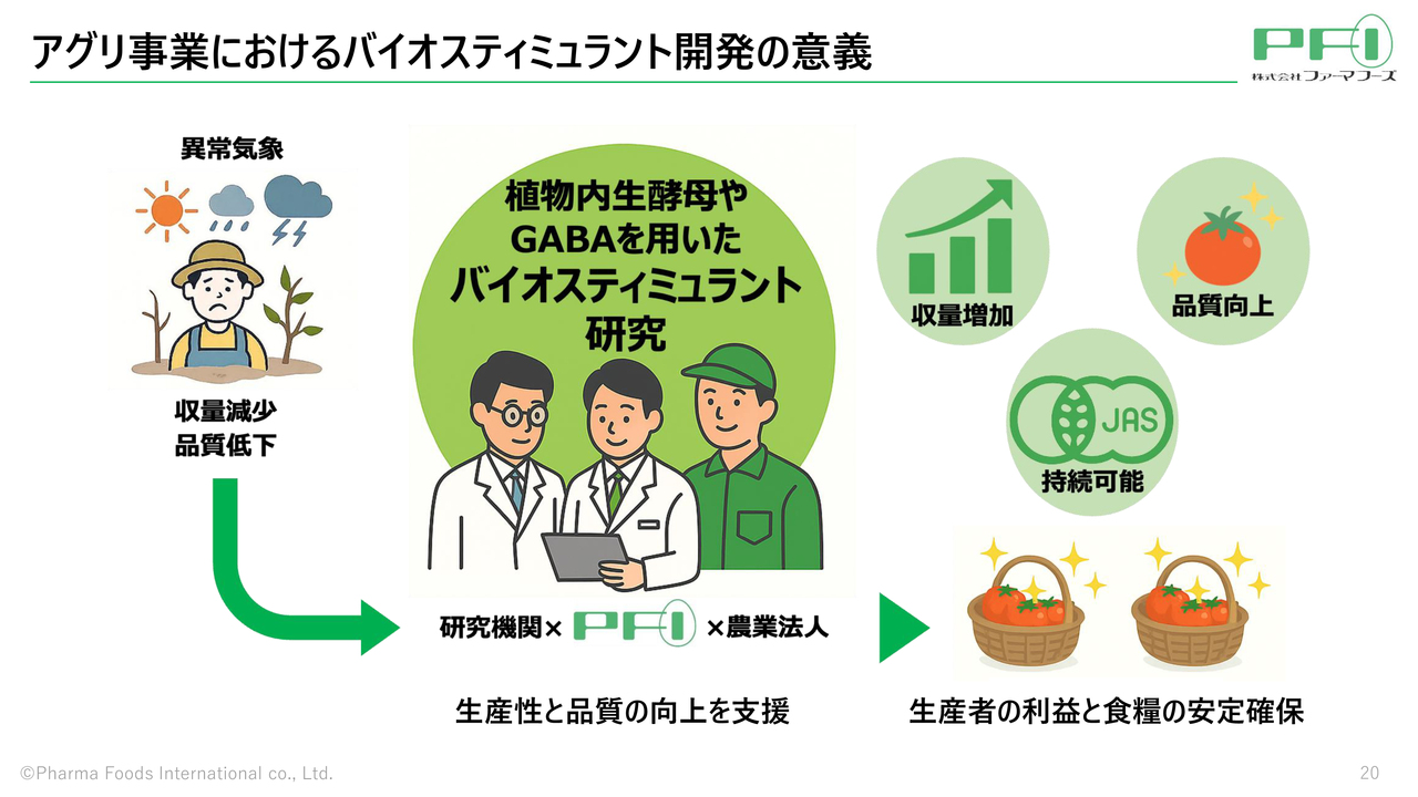 アグリ事業では、当社のバイオスティミュラントについて、生産量の多い水稲やトマトなどで効果が実証され、公的事業の支援を得て社会実装への体制を整えました。