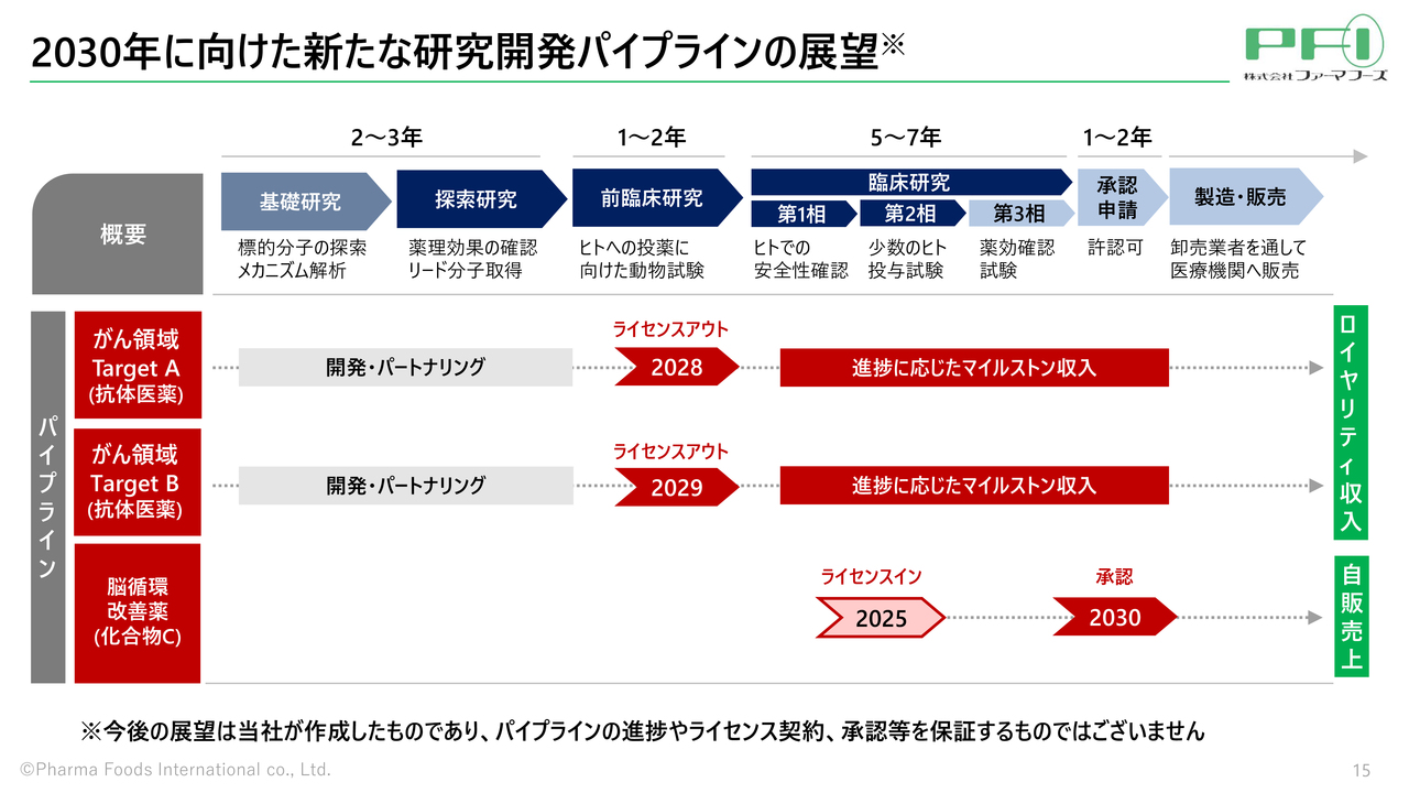 こちらのスライドは、2030年に向けた新たなパイプラインの展望を示しています。がん領域においては、2つの抗体医薬品候補の開発とパートナリングを進め、2029年までにライセンスアウトを目指します。