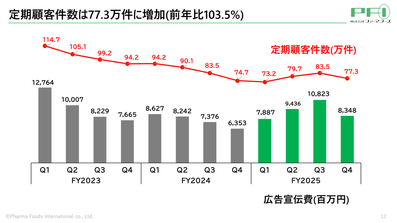 グループ全体の定期顧客件数は、2025年7月期末現在で77万3,000人となり、前年同期比で3.5パーセント増加しました。現在のところ、2026年7月期も同様の微増傾向を予測しています。