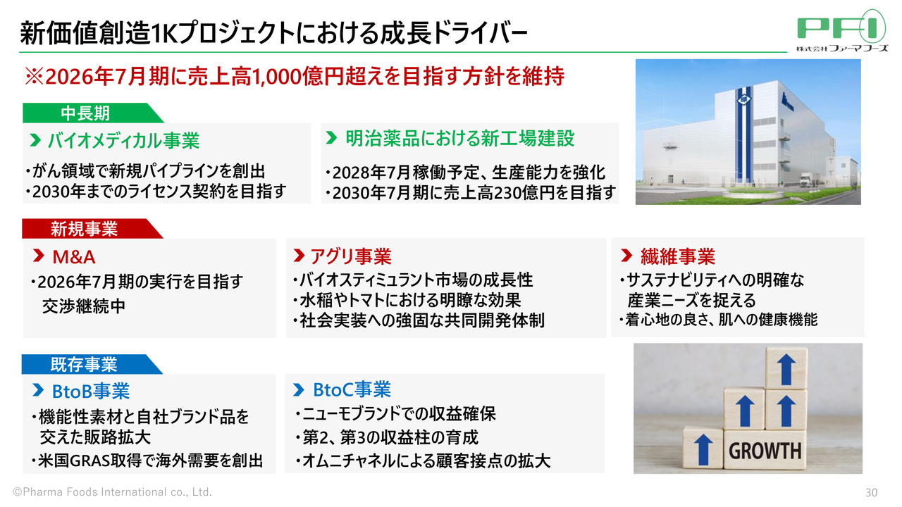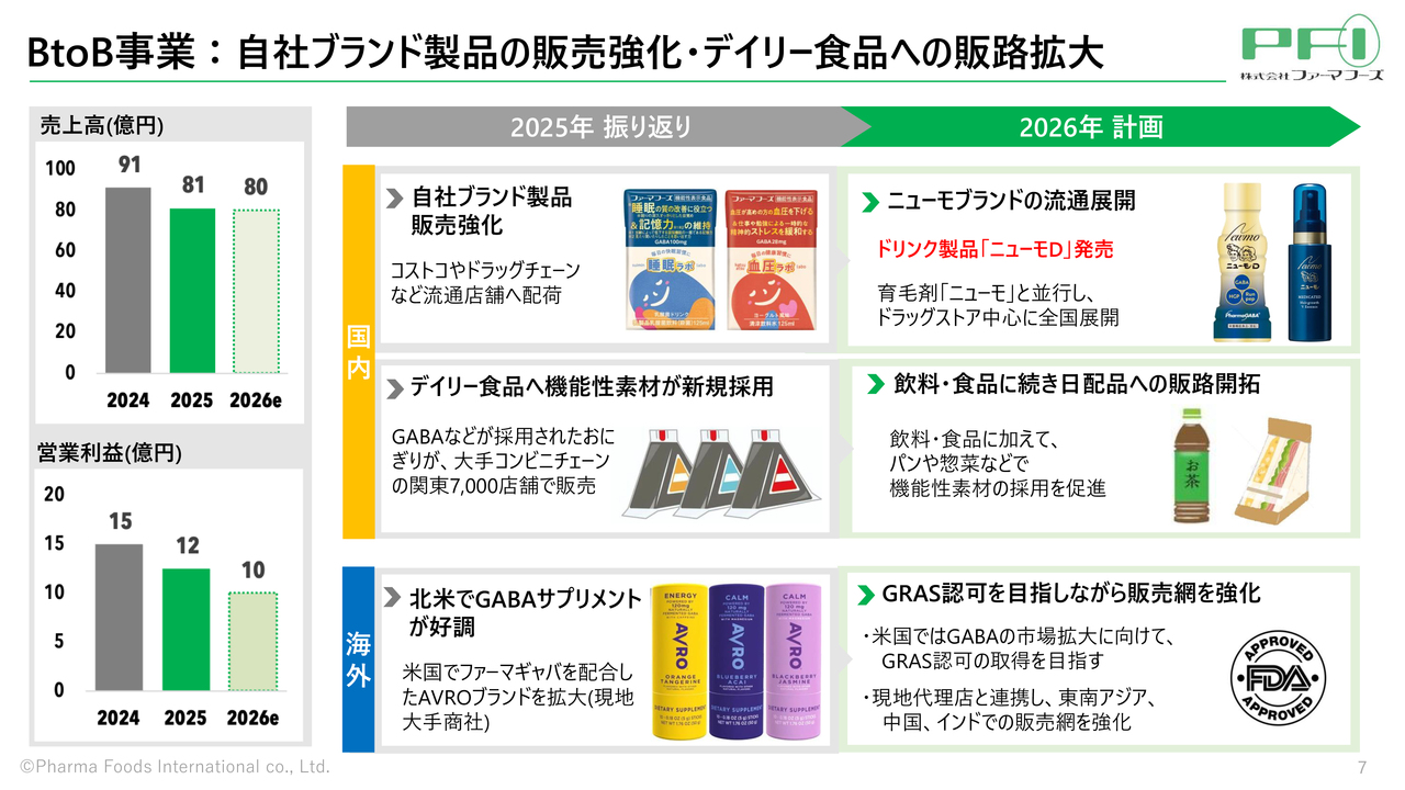 2026年7月期には、従来の飲料製品に加え、「ニューモ」ブランドのドリンク製品である「ニューモD」を新たに発売し、育毛剤「ニューモ」と並行して、ドラッグストアを中心に全国展開を目指します。さらに、おにぎりに続いて、パンや惣菜などデイリー食品への販路拡大を図っていきます。