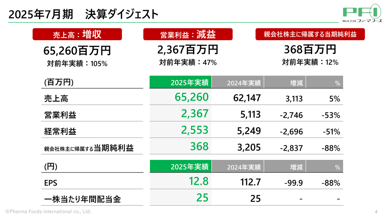 2025年7月期は前年比で増収減益となり、売上高は652億6,000万円、営業利益は23億6,700万円となりました。親会社株主に帰属する当期純利益は3億6,800万円となりましたが、1株当たりの年間配当金は前年と同額の25円を予定しています。