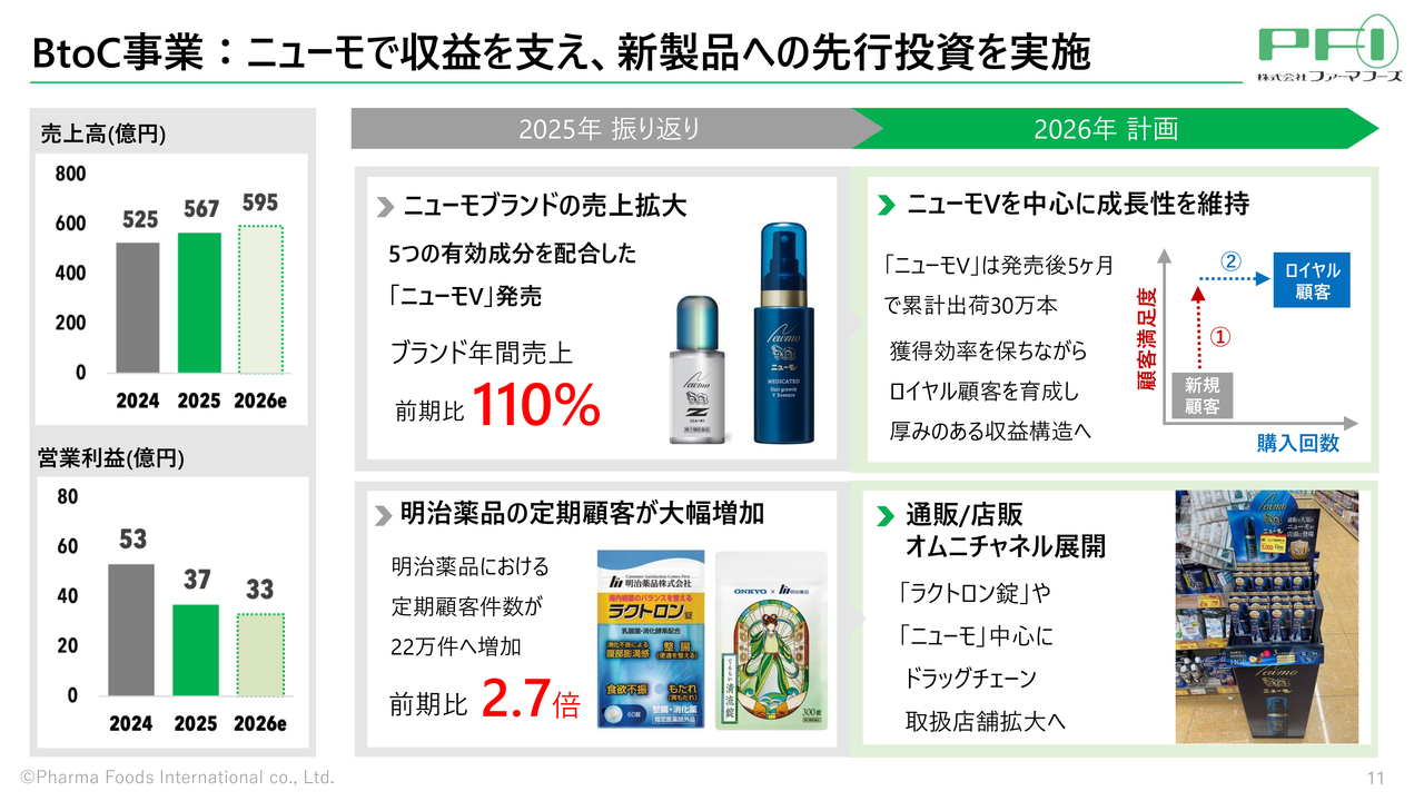 BtoC事業では、2025年7月期において、新たに「ニューモV(ファイブ)」を発売し、「ニューモ」ブランドの年間売上が前期比10パーセント増加することで、収益を支えました。