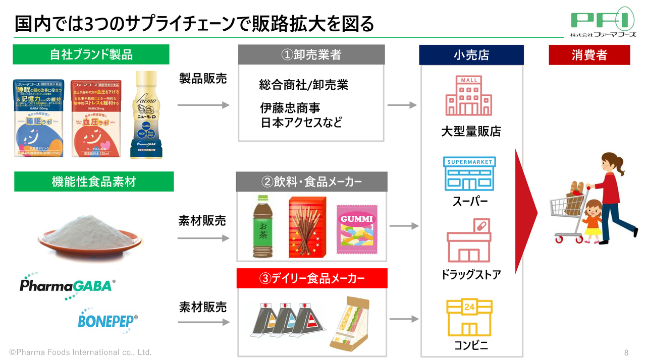 2025年7月期のトピックスとして、機能性食品素材が新たにデイリー食品メーカーに採用されたことは、着実な営業活動の成果です。「自社ブランド製品の卸売販売」「飲料・食品メーカーへの素材販売」といった従来のルートに、第3の販売ルートとして「デイリー食品メーカー」が加わりました。