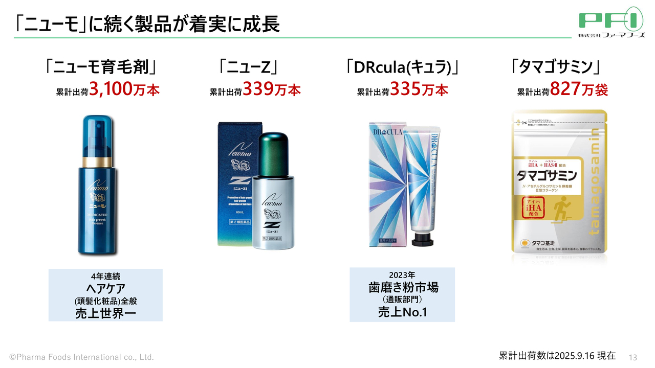 また、「ニューモ」に続く製品が着実に成長し、「ニューZ」「DRcula(キュラ)」がそれぞれ累計300万本を超え、「タマゴサミン」は累計827万袋とロングセラーとなりました。これらの製品などから、第2、第3の収益柱を育成し、より厚みのある収益構造を目指します。