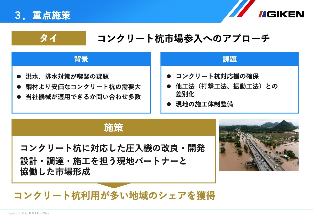 コンクリート杭に対応した圧入機の改良・開発を進めるとともに、現地パートナーと設計・調達・施工の協働体制を構築することで、コンクリート杭市場への参入を進め、タイ市場での存在感を高めていきます。