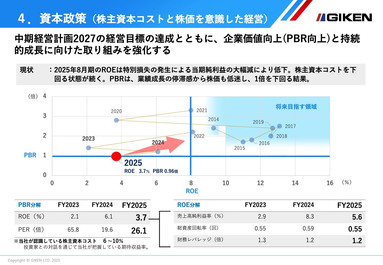 PBRを含め企業価値の向上に向けては、複数年でのROEの成果について改善が必要です。収益性や資産の効率性の改善を図っていき、ROEの向上に取り組み、結果を出していくことで、株主資本コストについても適正な期待値となるように取り組んでいきます。
