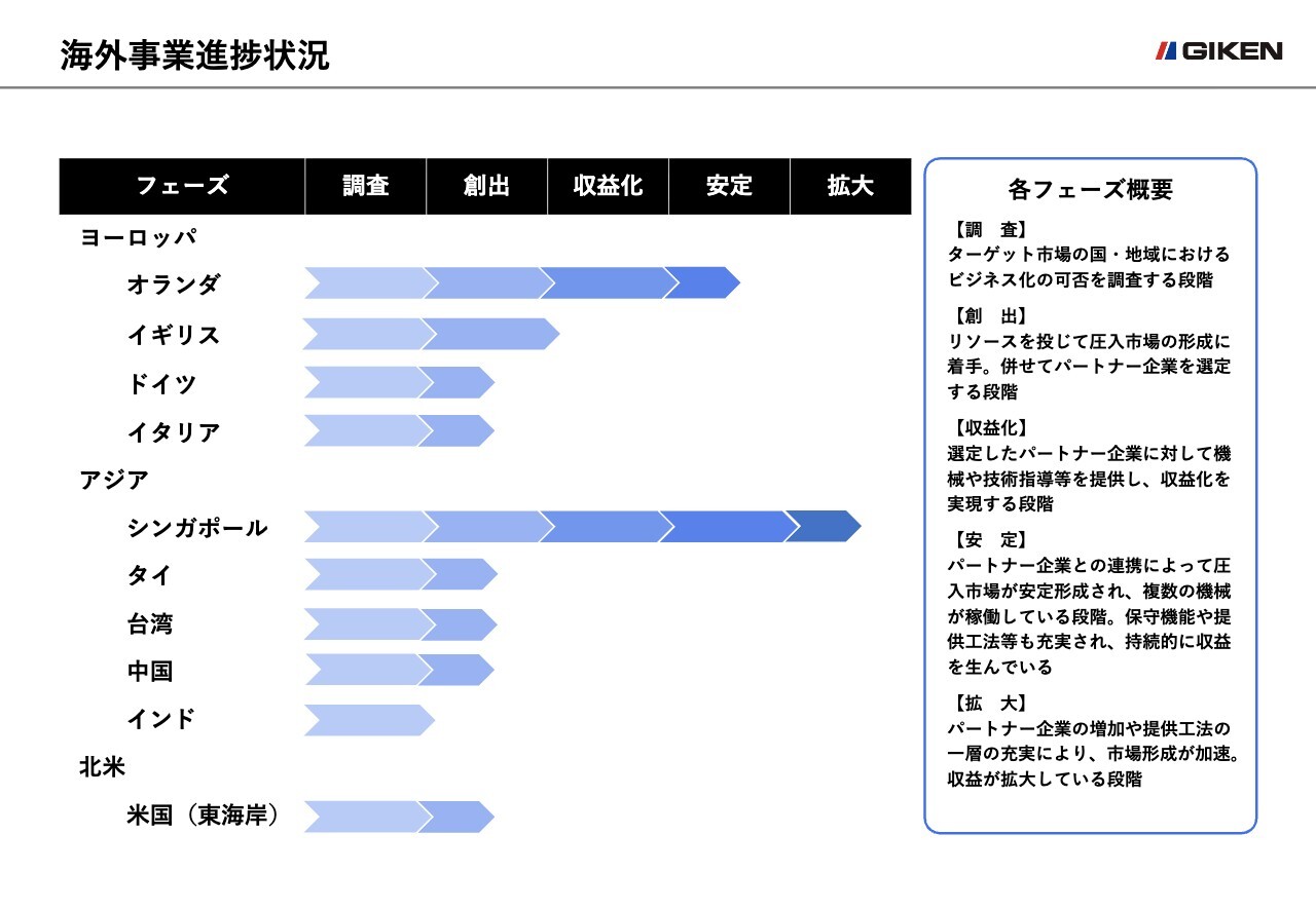 シンガポールにおいては、複数のGTOSS会員が存在し、ジャイロプレス工法も含めて工法採用が拡大していることから、拡大フェーズに位置付けています。このほかの地域についても、最優先課題である市場形成を中心に注力し、可能な限り早期に安定フェーズ、拡大フェーズに移行させていきたいと考えています。