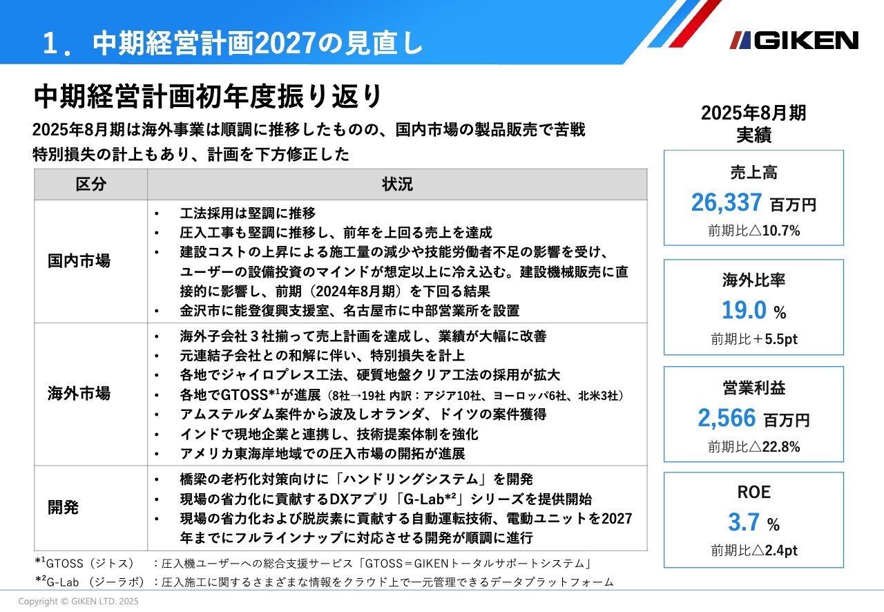 技研グループは、2024年10月11日に「中期経営計画2027」を発表し、「グローバルな技術提案・工法普及の活動強化」と「開発体制の整備・強化」の2点を強力に推進する方針を掲げ、尽力してきました。その結果、初年度(2025年8月期)については成果が大きく出ているところもあります。