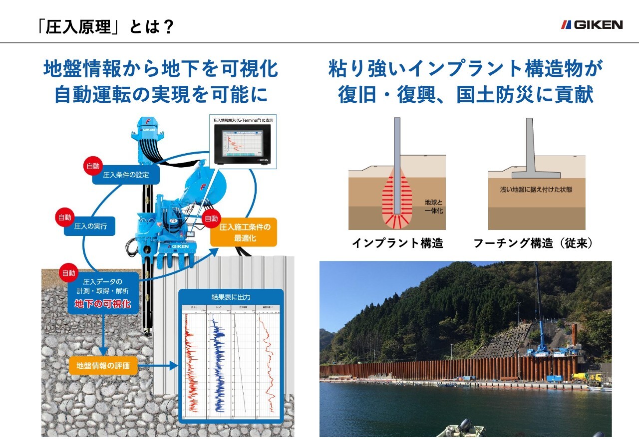 加えて、地中深く圧入した杭で構築する「インプラント構造物」は、地震や津波などの外力に粘り強く耐える特性を有しています。インプラント構造物は、東日本大震災の復旧・復興工事や南海トラフ巨大地震等に備えた対策工事で数多く採用され、国土防災に貢献しています。