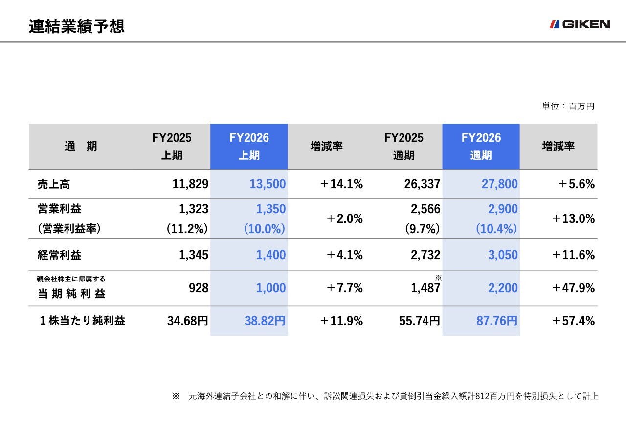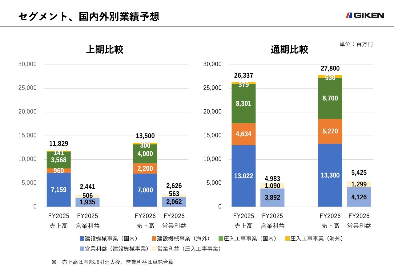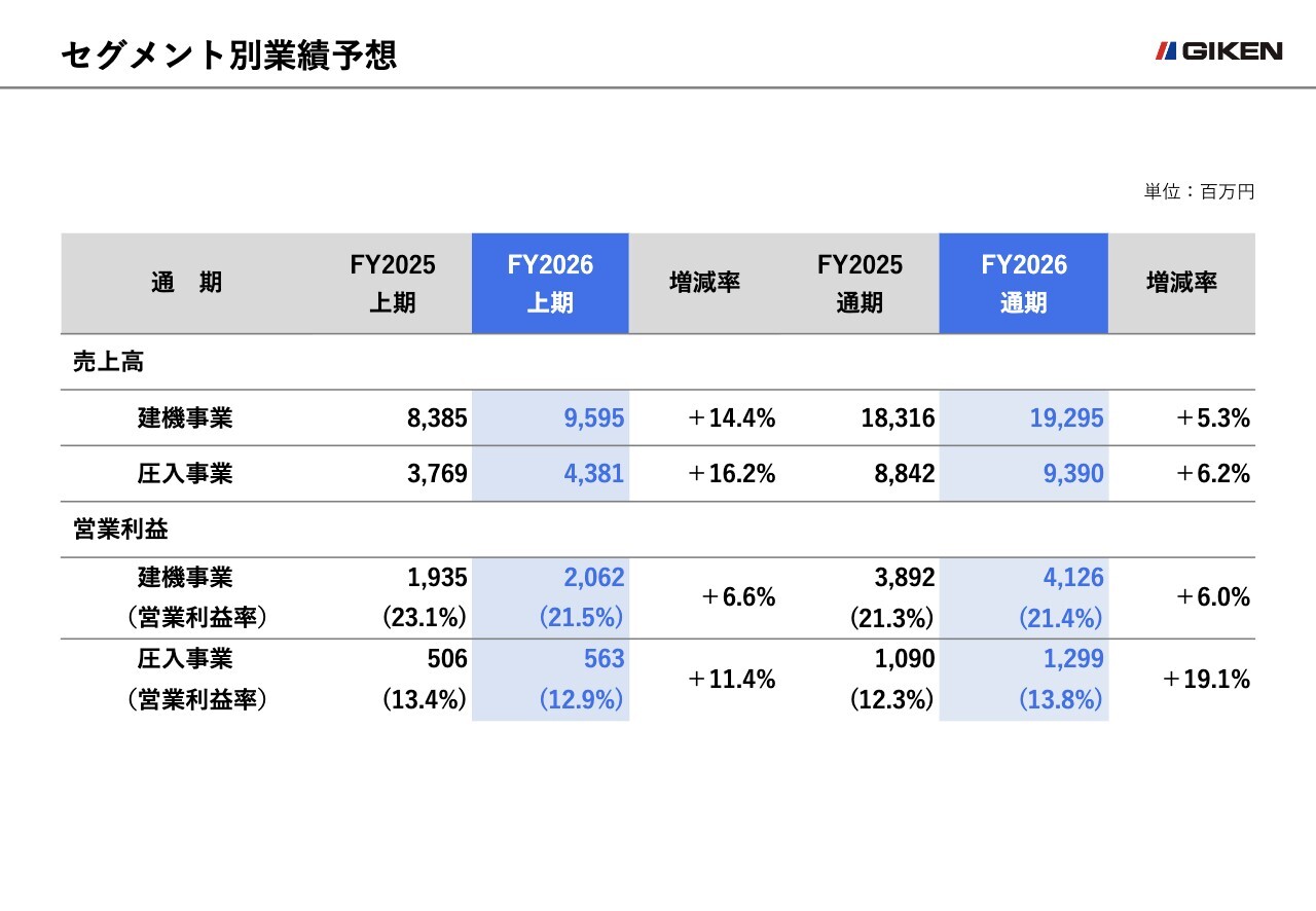 通期の売上高は、2025年8月期と比較し、建設機械事業の国内市場で2億7,700万円の増収、海外市場で6億3,500万円の増収、圧入工事事業の国内市場で3億9,800万円の増収を見込んでいます。