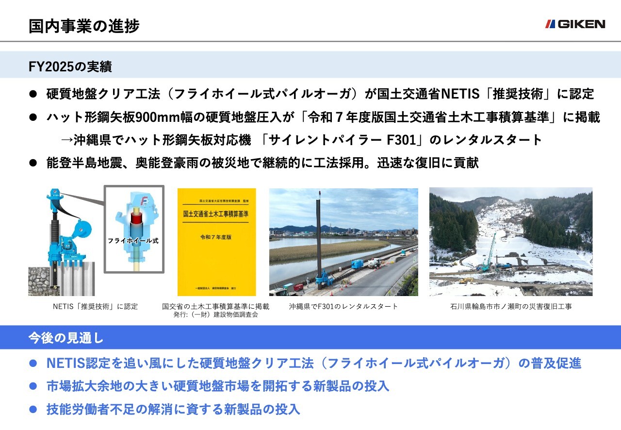 まず国内事業の実績ですが、フライホイール式パイルオーガを用いた硬質地盤クリア工法が、国土交通省のNETISの令和7年度推奨技術に選定されました。本認定により、通常のNETIS登録技術よりも工事成績評定や総合評価方式における加点数がアップするため、さらなる工法普及が期待できます。