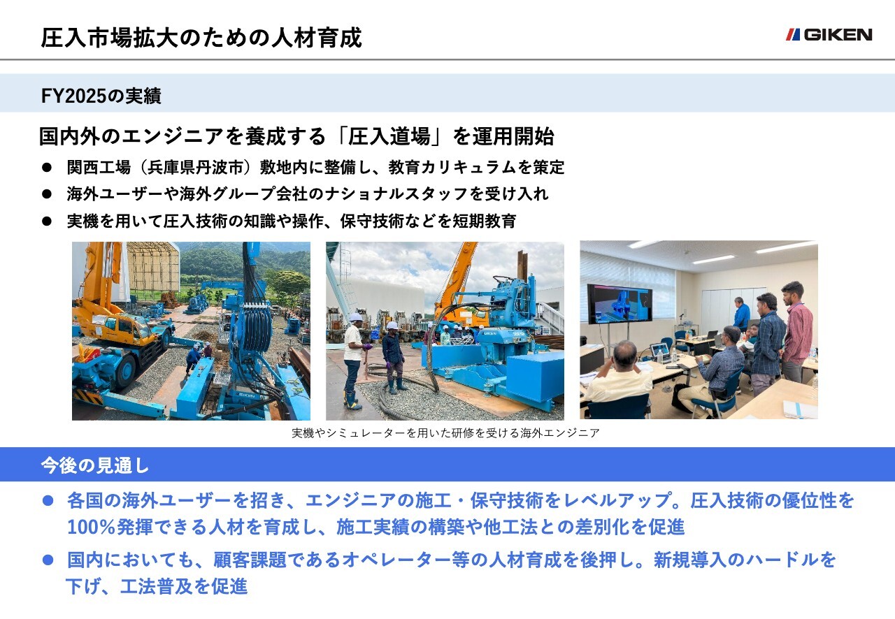 今後は各国の海外ユーザーを招いてエンジニアの施工・保守技術のレベルアップを図るとともに、圧入技術の優位性を100パーセント発揮できる人材を育成し、施工実績の構築や他工法との差別化を促進していきます。