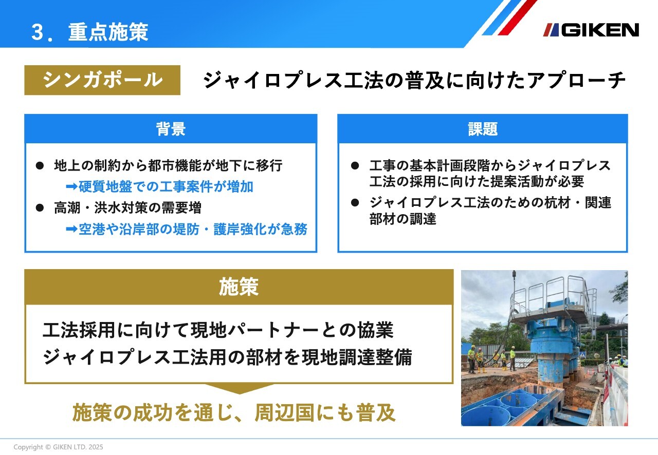 シンガポールでのジャイロプレス工法の普及拡大を目指し、現地パートナー企業との協働体制強化と部材の現地調達環境の整備を実施していきます。さらに、周辺国への展開を狙ったアプローチも進めていきます。