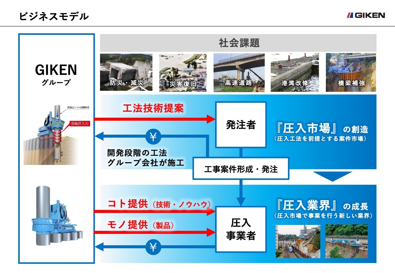 そのうち、開発段階の工法については、圧入工事のスペシャリストである技研施工が請け負います。工事を成功に導き、実績を積み重ねることで新工法の市場を広げ、一定程度広がった段階で一般ユーザーに工法を開放し、機械やノウハウを販売していきます。圧入市場が広がるほどユーザーの数、仕事量とも拡大し、「圧入業界」が成長していきます。
