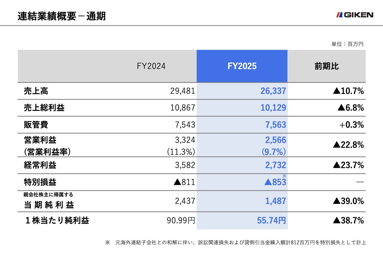 営業利益は前年同期比22.8パーセント減の25億6,600万円となり、経常利益は前年同期比23.7パーセント減の27億3,200万円となりました。親会社株主に帰属する当期純利益は、営業利益の減少に加え、元海外連結子会社との和解に伴う特別損失の計上により、前年同期比39.0パーセント減の14億8,700万円となりました。