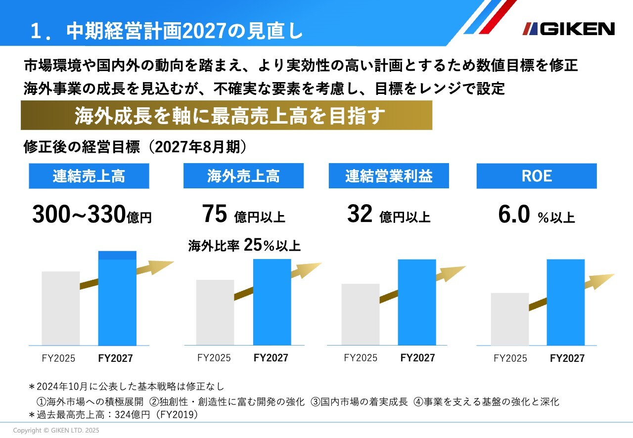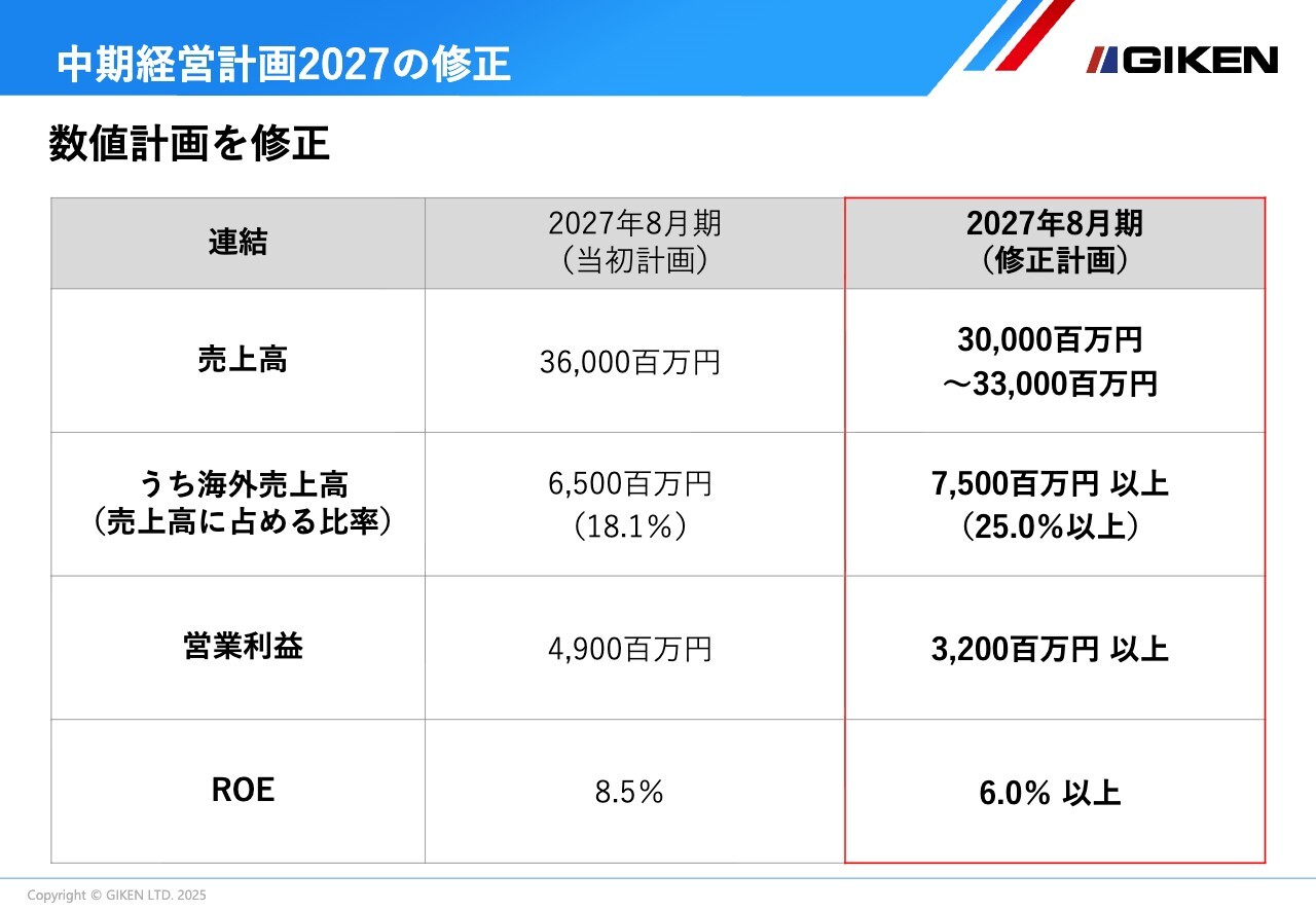 「中期経営計画2027」の最終年度である2027年8月期の目標数値を見直し、連結売上高は300億円から330億円、海外売上高は75億円以上、海外売上高比率は25パーセント以上、連結営業利益は32億円以上、ROEは6.0パーセント以上に修正しました。
