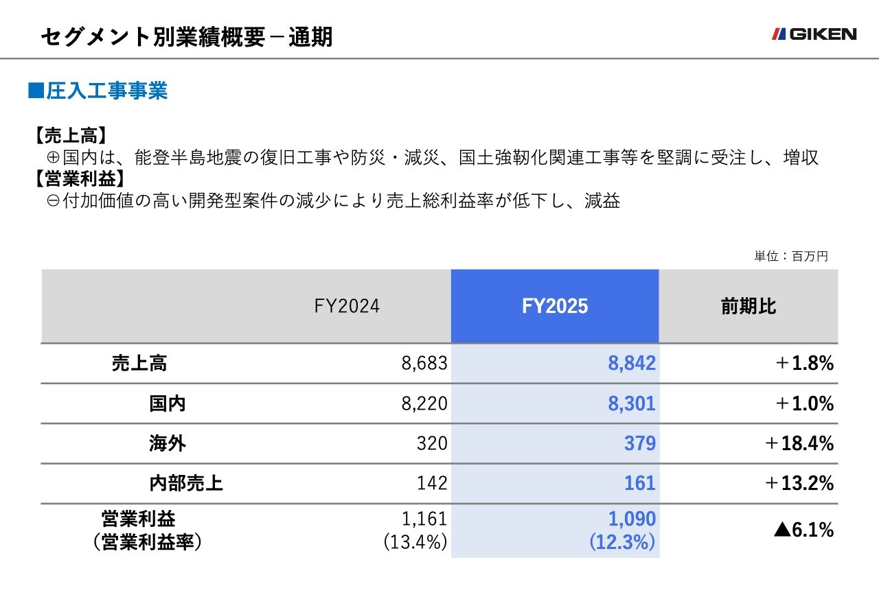 圧入工事事業については、売上高は前年同期比6.2パーセント増の93億9,000万円、営業利益は前年同期比19.1パーセント増の12億9,900万円を見込んでいます。