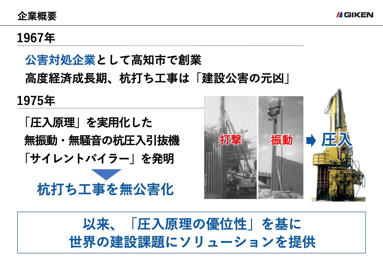 当社は1967年、「公害対処企業」を掲げ、土木工事会社として高知市で創業しました。当時は高度経済成長期の真っただ中、杭打ち工事は建設公害の元凶とされていました。