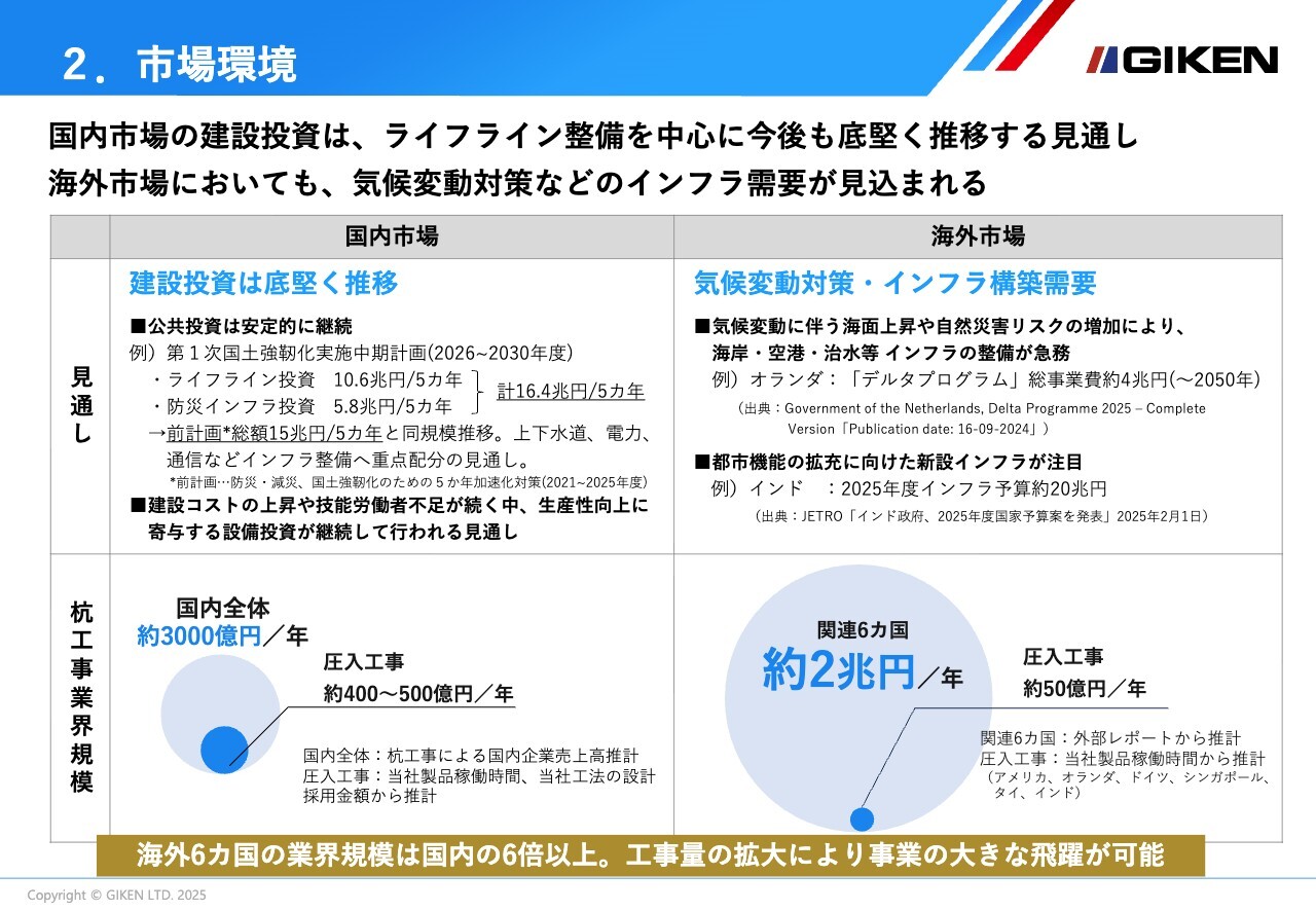 一方、海外市場では、自然災害の激甚化による被害が顕著になっており、気候変動対策のためのインフラ整備が急務となっています。また、成長著しい国の都市化が進み、都市機能のためのインフラ構築需要が高まっており、インフラ整備は旺盛だと見込んでいます。
