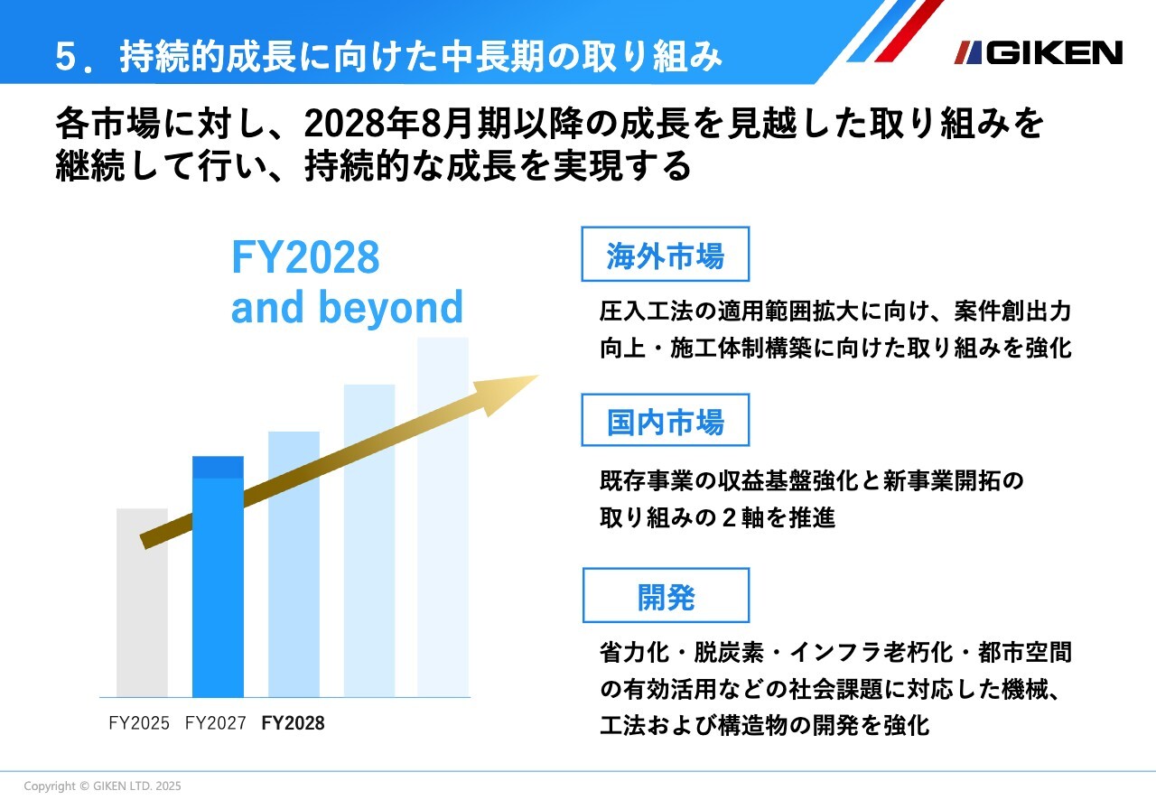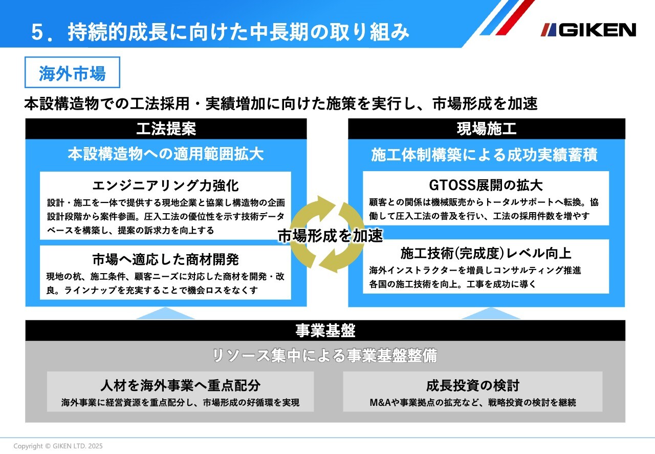 なお、中期経営計画における基本戦略についての変更はなく、グローバルな技術提案・工法普及の活動強化と開発体制の整備・強化を強力に推進し続けていきます。