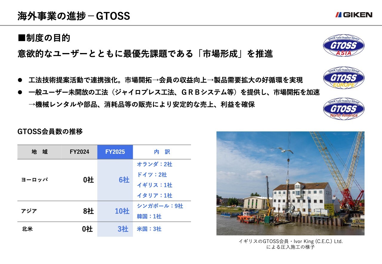 GTOSS会員数については2025年8月期、ヨーロッパ地域は0社から6社に、アジア地域は8社から10社に、北米地域は0社から3社に増えており、それに伴い海外売上が伸長しています。今後も会員企業の拡大と連携の強化を通じて、海外市場開拓を加速していきます。