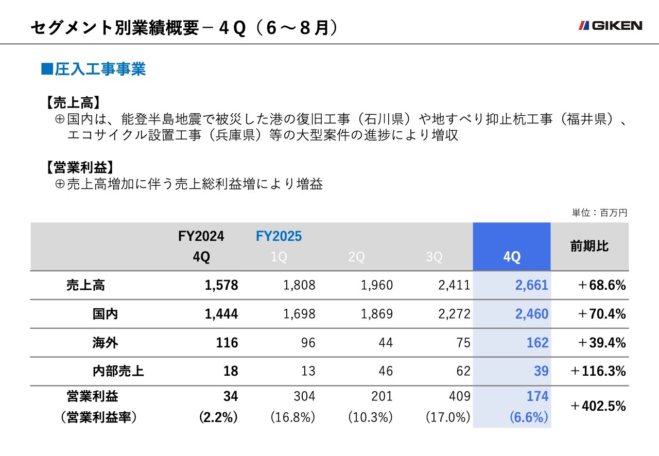 圧入工事事業については、売上高は前年同四半期比68.6パーセント増の26億6,100万円となりました。主な要因は国内における堅調な工事受注です。能登半島地震で被災した港の復旧工事や地すべり抑止杭工事、エコサイクル設置工事等の大型案件により、国内市場の売上高は前年同四半期比70.4パーセント増の24億6,000万円となりました。