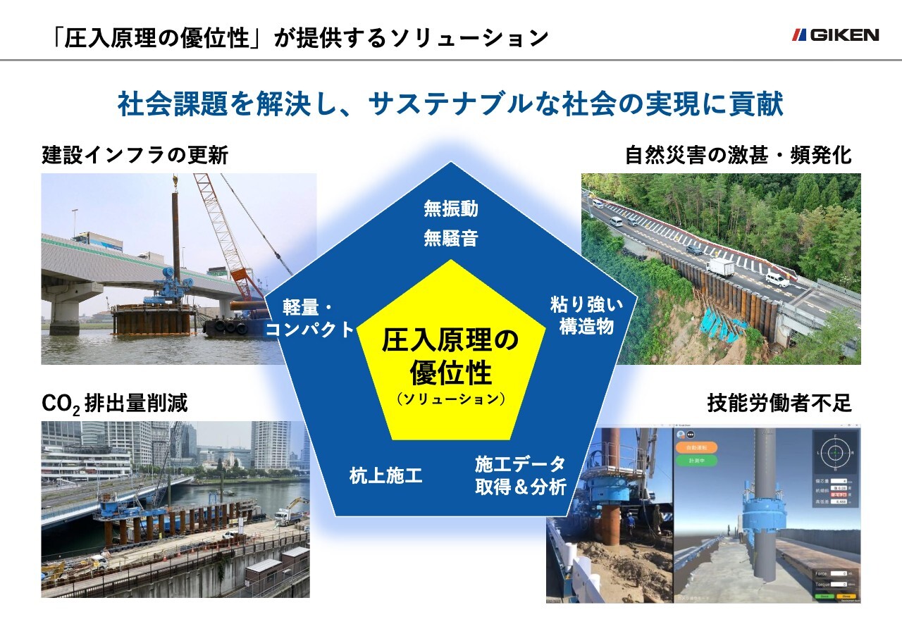 社会課題の解決を原点とする私たちは、「インプラント工法で世界の建設を変える」を掲げ、「サイレントパイラー」で公害や自然災害から人々を守ってきました。またエコデザイン製品で文化的かつ快適な空間を創出することにより、建設課題の解決策をつくり、新たな選択肢を提供するというミッションを遂行してきました。