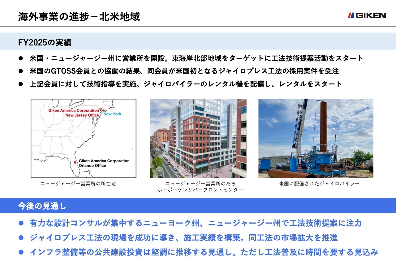 今後の見通しとしては、ニュージャージー州の営業所を拠点とし、設計コンサルタントが集中する同州およびニューヨーク州で工法技術提案に注力していきます。