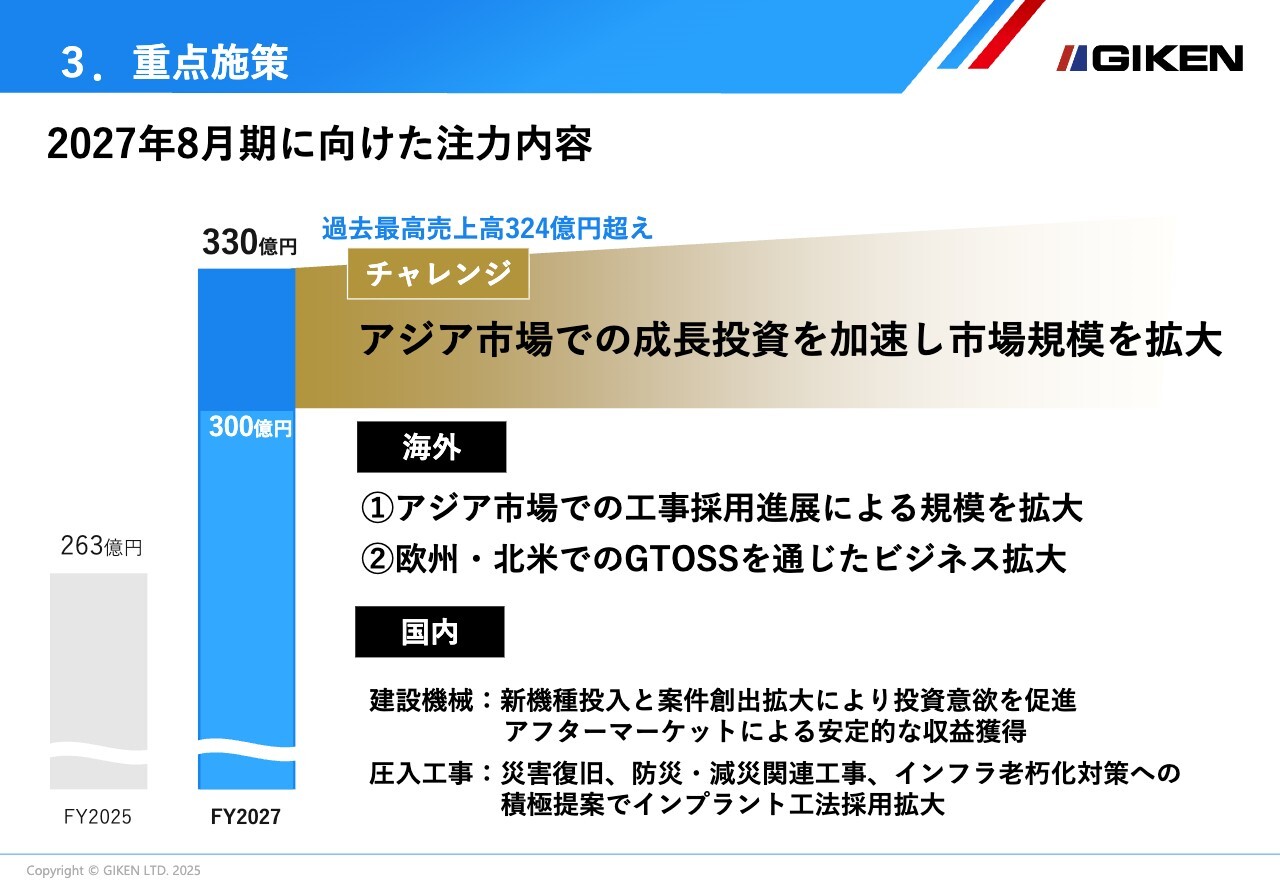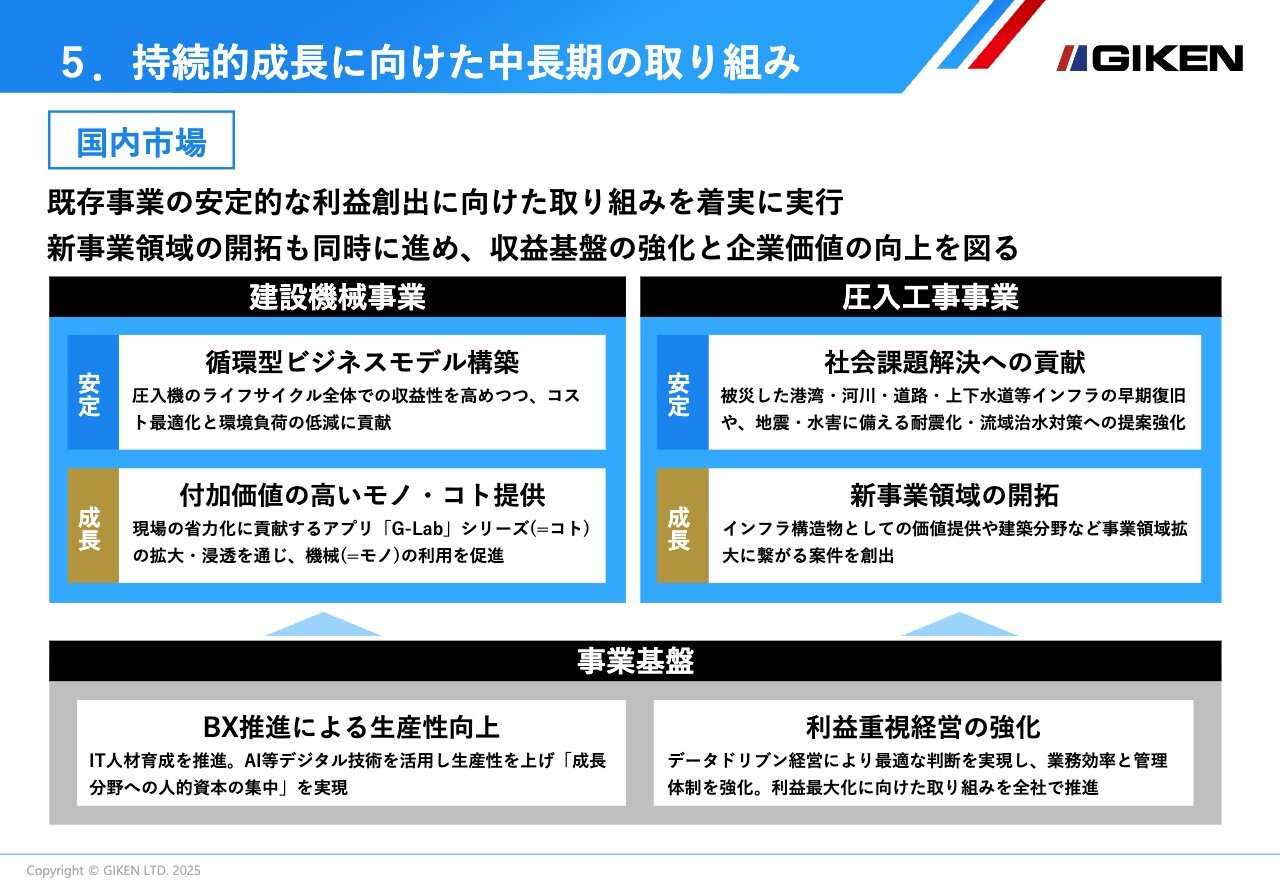 国内市場については、建設機械事業では、新機種投入と案件創出拡大によって投資意欲を喚起し、アフターマーケットで安定収益を獲得していきます。圧入工事事業では、災害復旧や防災・減災、インフラ老朽化対策への積極提案を行い、インプラント工法の採用拡大を図ります。
