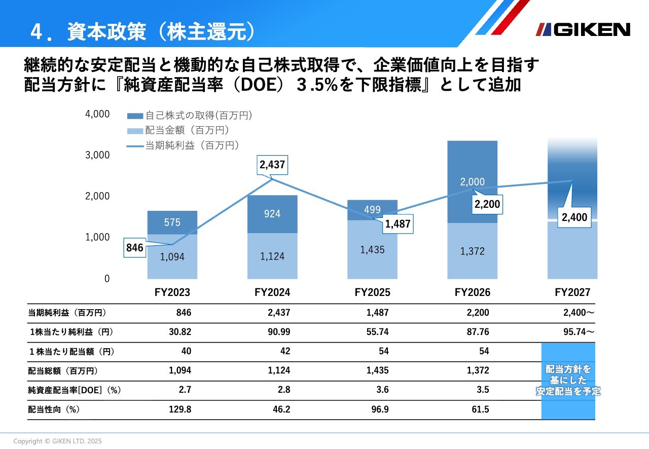 なお、今後も安定配当を継続するため、現中期経営計画期間中の2026年8月期および2027年8月期の配当方針に純資産配当率(DOE)を下限指標として追加し、配当方針を「配当性向は40パーセントを目安としつつ、DOE3.5パーセントを下限指標とする」としました。