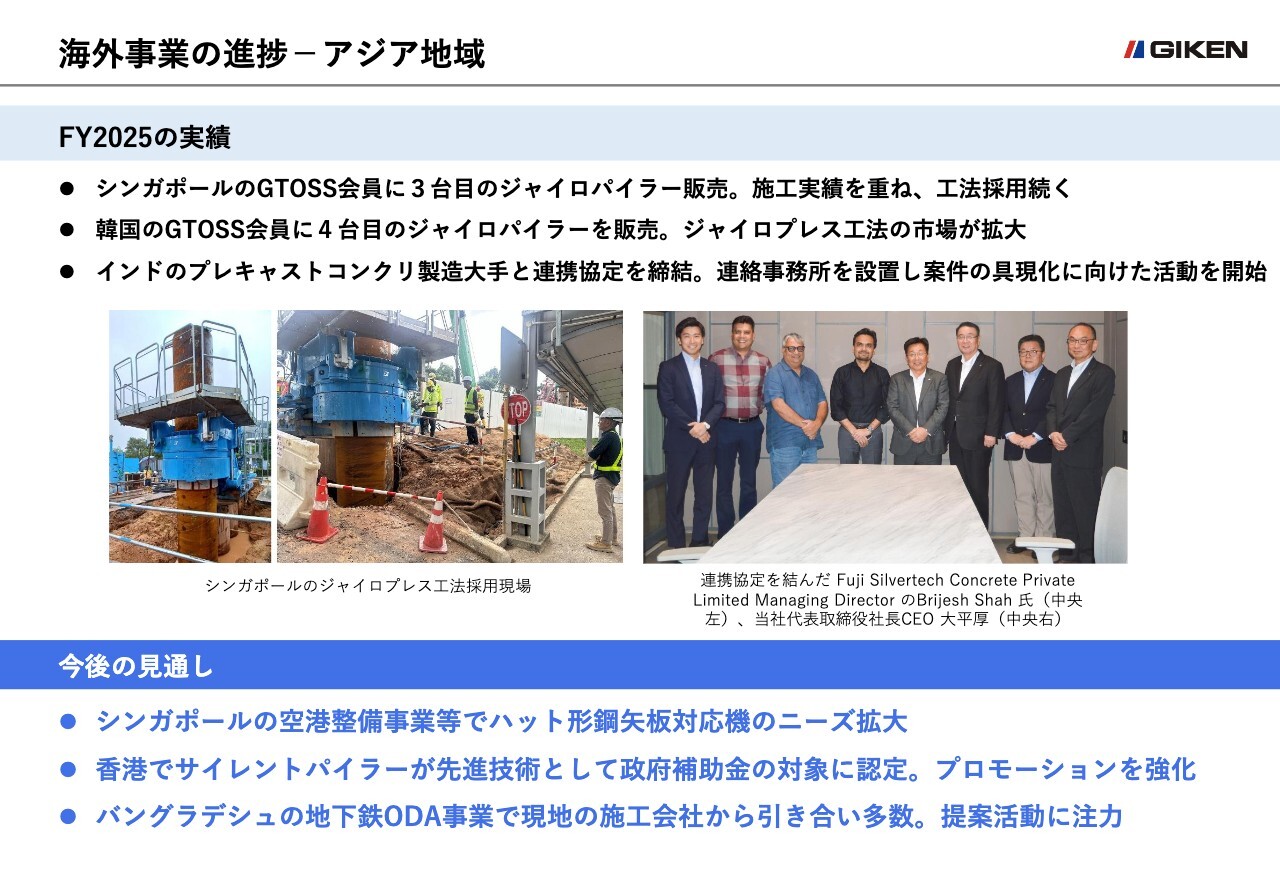 また韓国においても、ジャイロプレス工法の市場拡大を受け、GTOSS会員に4台目の「ジャイロパイラー」を販売しています。巨大市場を抱えるインドにおいては、プレキャストコンクリート製造大手と連携協定を結び、市場創出に向けた具体的な活動をスタートさせました。