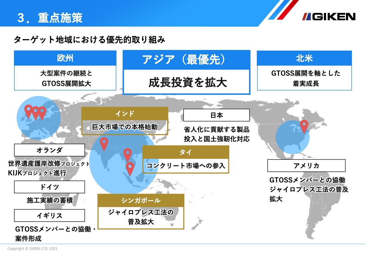 先ほど申し上げた通り、アジア市場を最優先地域と位置付け、特に、インド、タイ、シンガポールへの成長投資を実施します。詳細については、次のスライドでご説明します。