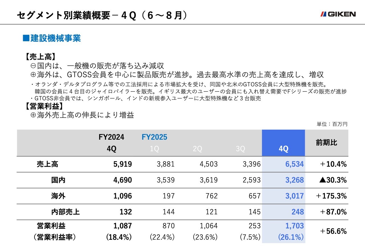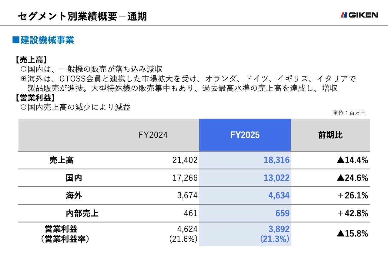 建設機械事業の売上高は、国内市場で前年同期比24.6パーセント減と大きく落ち込み、トータルでは前年同期比14.4パーセント減の183億1,600万円となりました。しかし、海外市場においては、GTOSS会員と連携した市場開拓が成果を上げ、会員向けの製品販売が進捗したことで過去最高水準の売上を達成することができました。