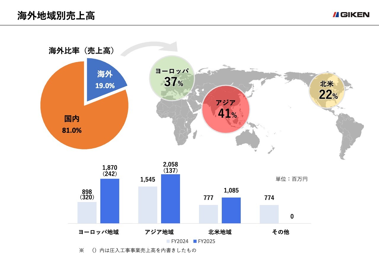海外売上高は、前年同期比25.5パーセント増の50億1,300万円となりました。また海外売上高比率は19.0パーセントとなり、20パーセント台目前まで拡大しました。地域別の構成比率は、ヨーロッパが37パーセント、アジアが41パーセント、北米が22パーセントです。