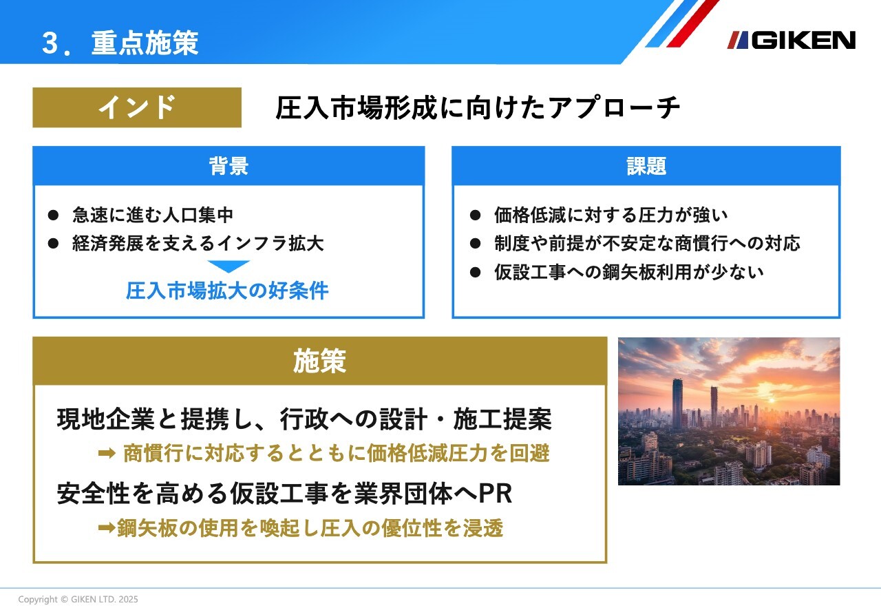 また、建設現場の安全管理体制が未成熟なインドにおいては、安全性の向上に資する仮設工事の重要性を業界団体に積極的にPRし、鋼矢板の使用を喚起し、圧入工法の優位性を浸透させていきます。