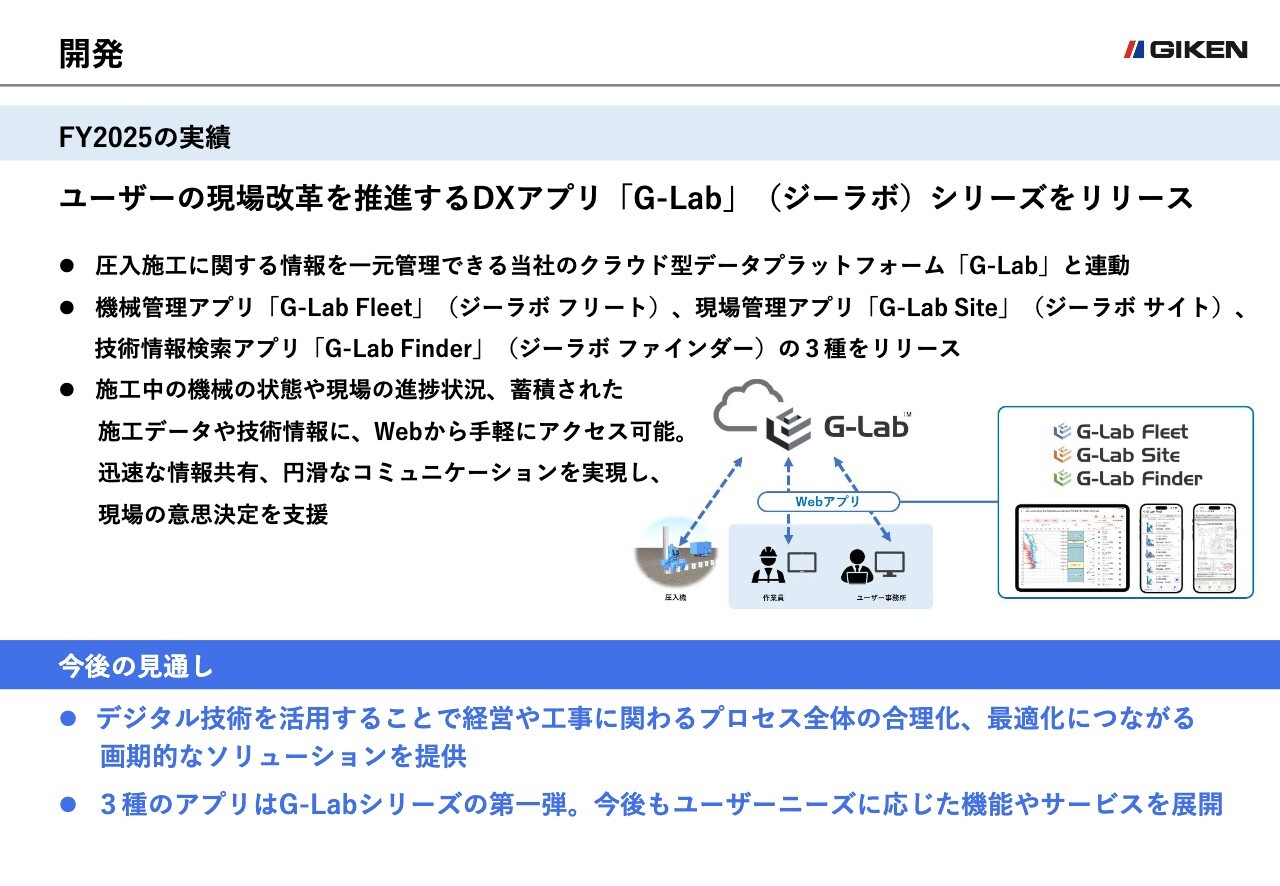 開発においては、顧客ニーズに対応する製品・サービスの市場投入を行っており、空頭制限下での硬質地盤圧入を効率的に実施できる新型アタッチメント「ハンドリングシステム」や、現場の省力化に貢献するDXアプリ「G-Lab」シリーズの提供を開始しており、インフラ老朽化対策や現場の省人化ニーズに応える製品・サービスの提供を行っています。