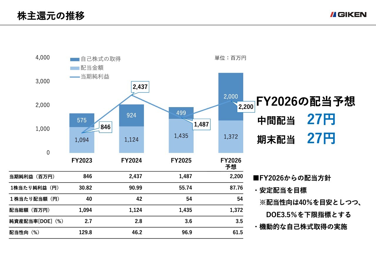 また機動的な自己株式取得の実施も掲げており、2026年8月期は上限20億円の自社株買いを予定しています。当期は年間配当額54円、DOE3.5パーセント、配当性向61.5パーセントとなる見通しです。