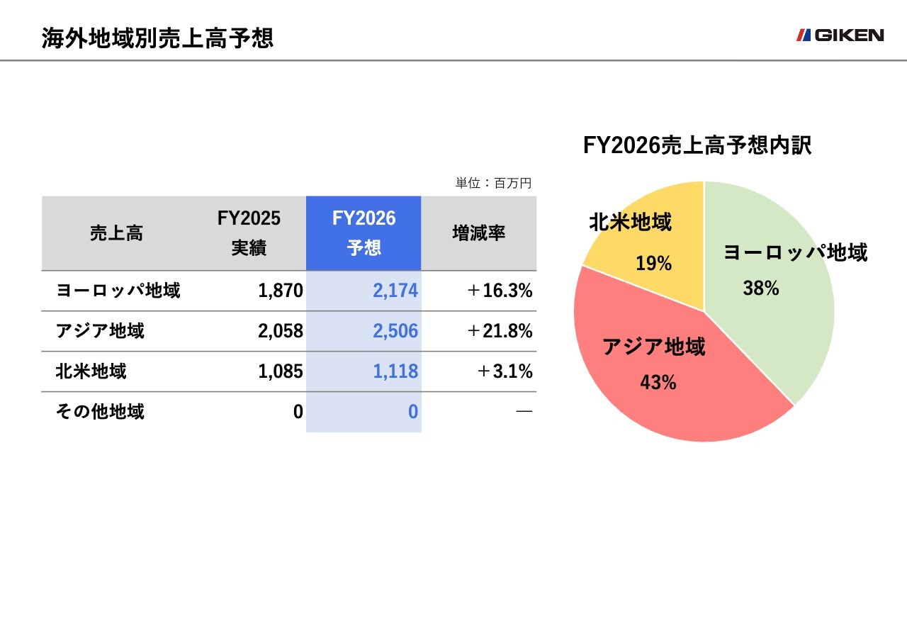 海外売上高の合計は前年同期比15.7パーセント増の58億円を見込んでいます。内訳は、ヨーロッパ地域が21億7,400万円、アジア地域が25億600万円、北米地域は11億1,800万円で、3地域そろっての増収を予測しています。