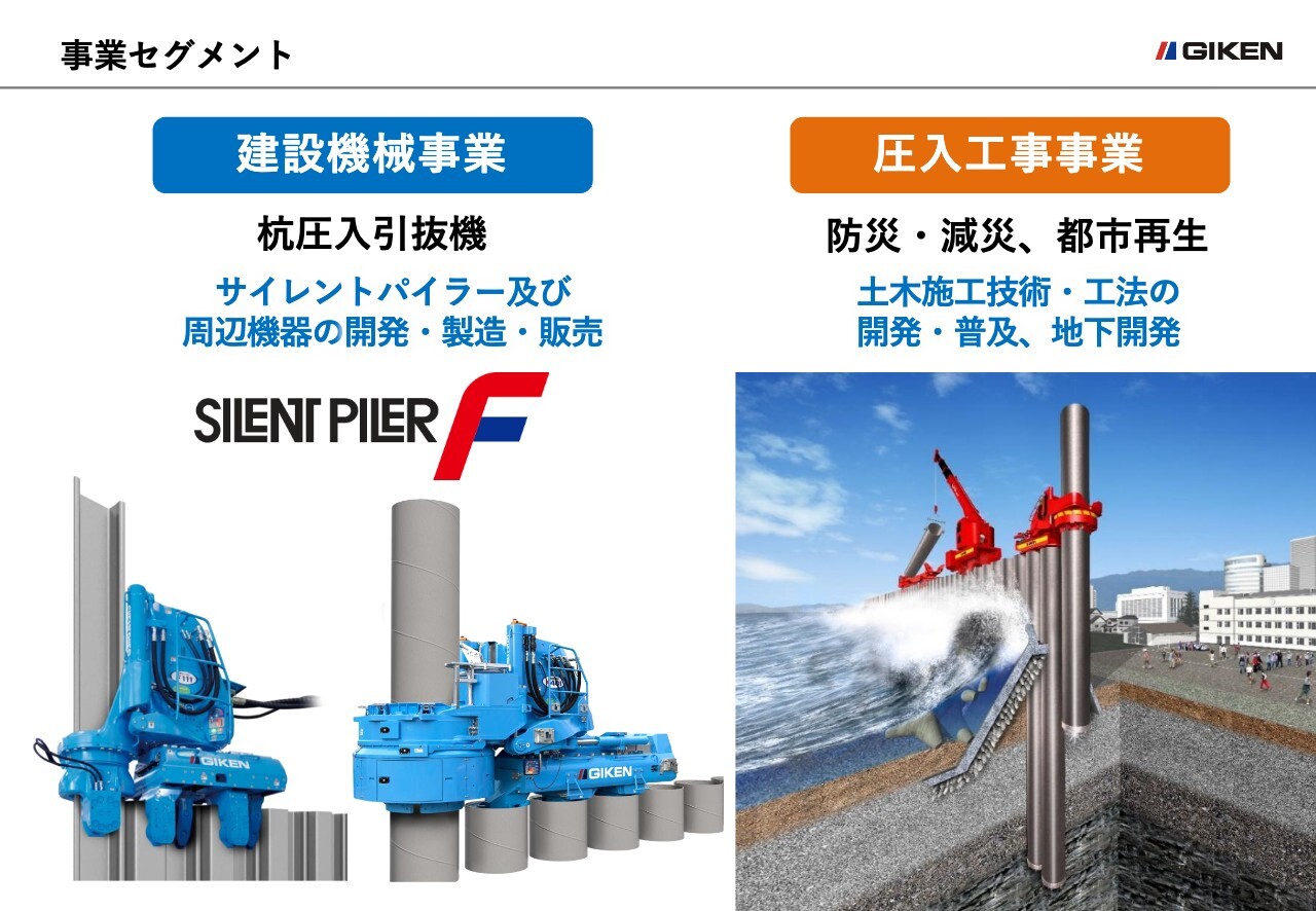 技研グループのセグメントには建設機械事業と圧入工事事業があります。建設機械事業は、「サイレントパイラー」および周辺機器の開発・製造・販売や保守をメインとした事業です。圧入工事事業は、圧入施工のスペシャリストであるグループ会社の技研施工を通じ、主に開発段階にある製品・工法を用いて実際に工事を行う事業になります。