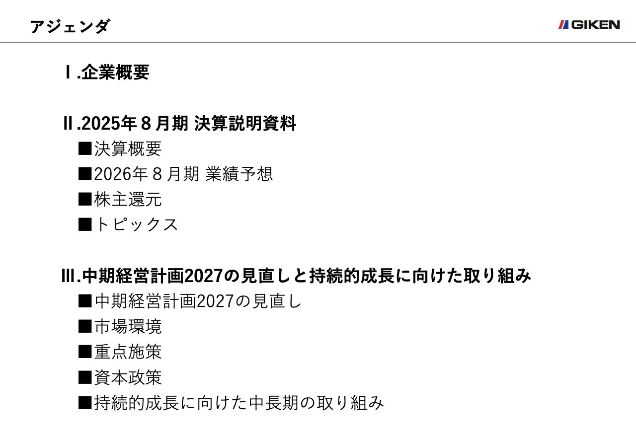 本日はスライドにお示ししていますとおり、まず当社の概要を説明し、続いて2025年10月10日に発表した2025年8月期の決算説明、最後に2024年10月に公表した「中期経営計画2027」の見直しと、今後の持続的成長に向けた取り組みについてご説明します。