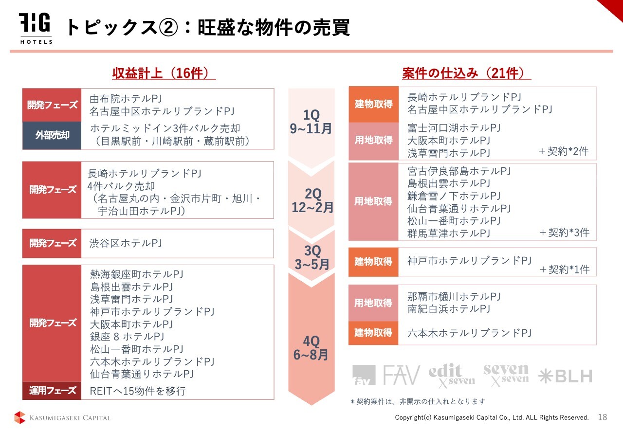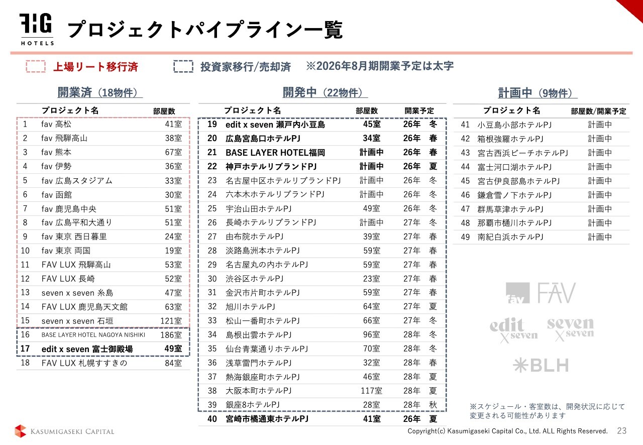 また、18番の「FAV LUX 札幌すすきの」と40番の宮崎市橘通東ホテルPJ以外は、すべてオフバランスされています。今後の計画中の案件についても、基本的には順次、開発ファンドに組み入れることでオフバランスしていく予定であり、こちらも非常に順調に推移しています。