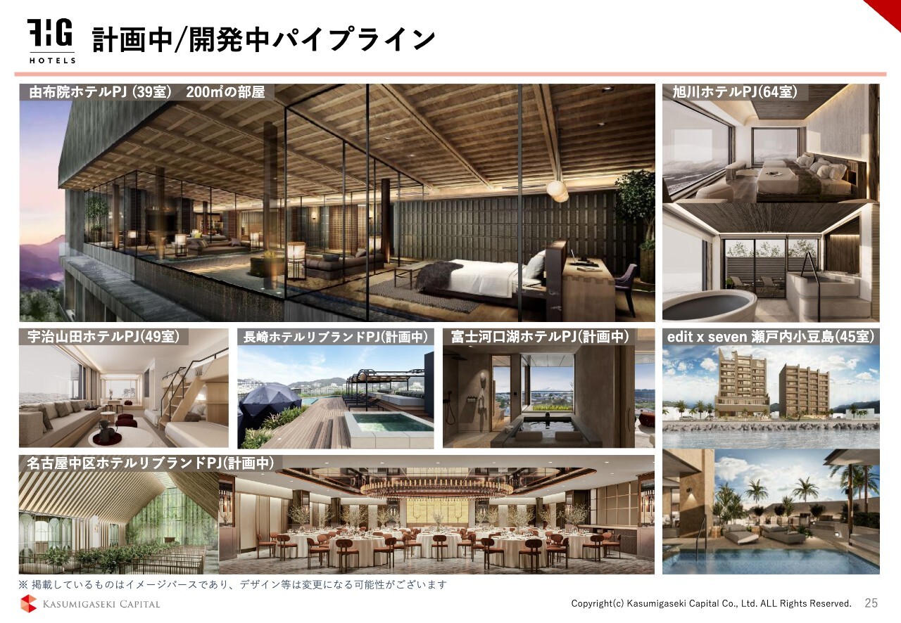 最後に、現状のパイプラインの写真です。いくつかご紹介します。左上は由布院です。来年度末から2027年の年初にかけてオープンを予定しており、「seven x seven」の3つ目のブランドとして、大分県由布院に開業します。