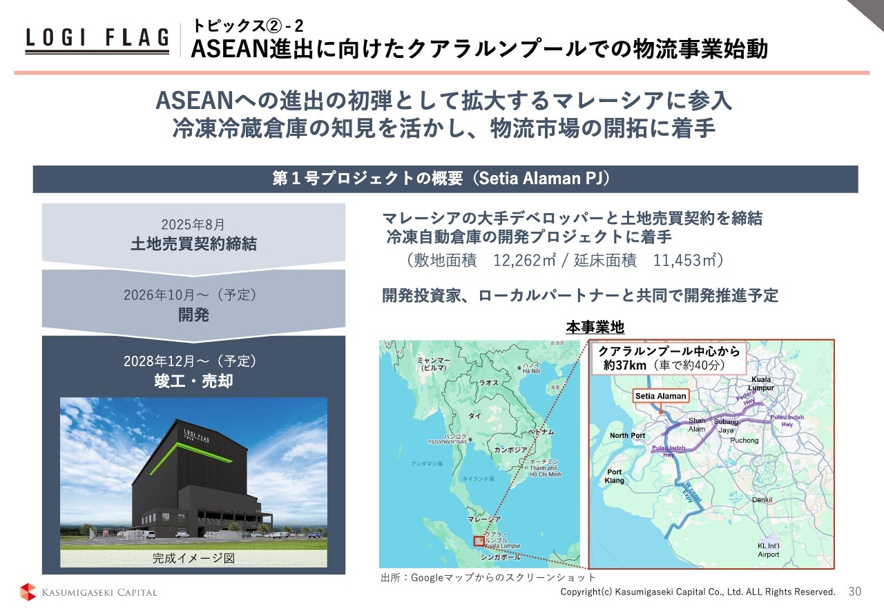 マレーシアでは、先ほどのポートクランという大きな港とクアラルンプールという首都の間がプライム立地と考えており、その中にある「Setia Alaman(セティア・アラマン)」で土地を取得し、これから冷凍自動倉庫の開発を進めたいと考えています。マレーシアでは、日本のデベロッパーが日本の最新技術を用いた冷凍自動倉庫を建設するということで話題になっており、最初の手応えとして非常に良好だと感じています。
