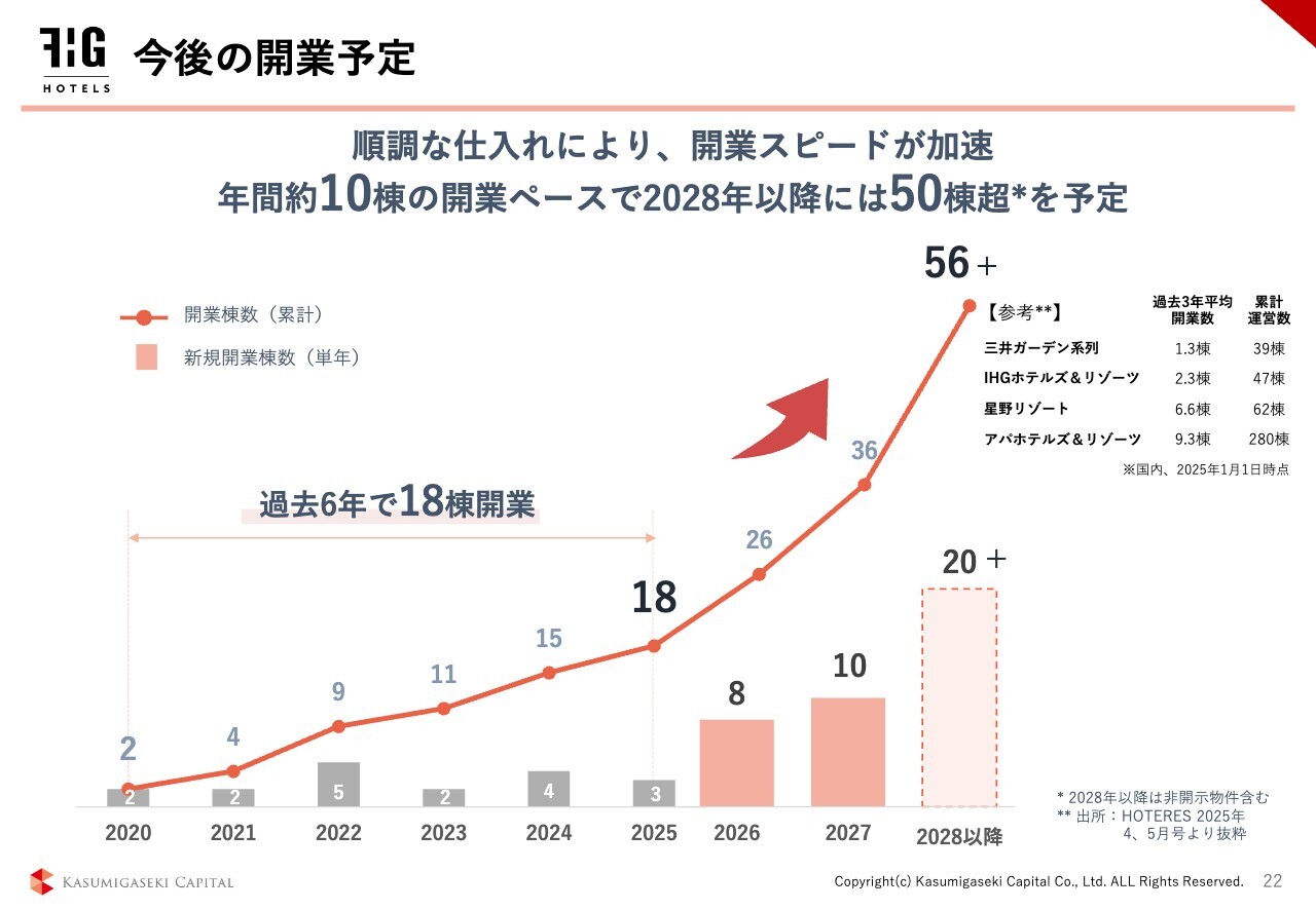 また、特に開業ペースですが、我々の年平均10棟以上というペースがどの程度のものかと言うと、最大手のアパホテルさまが、過去3年で平均9棟のペースで開業しており、それを上回るペースでの開業をこれから実現していきます。