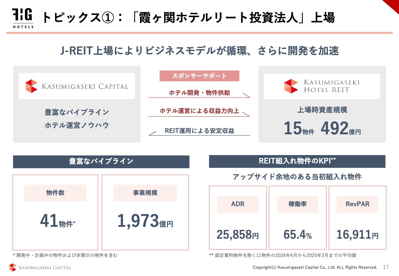 2025年8月期のトピックスです。冒頭の説明にもありましたとおり、今年8月にJ-REIT上場を果たしました。ホテル事業を開始した当初から目標としていたJ-REIT上場を、無事に達成できたと思います。